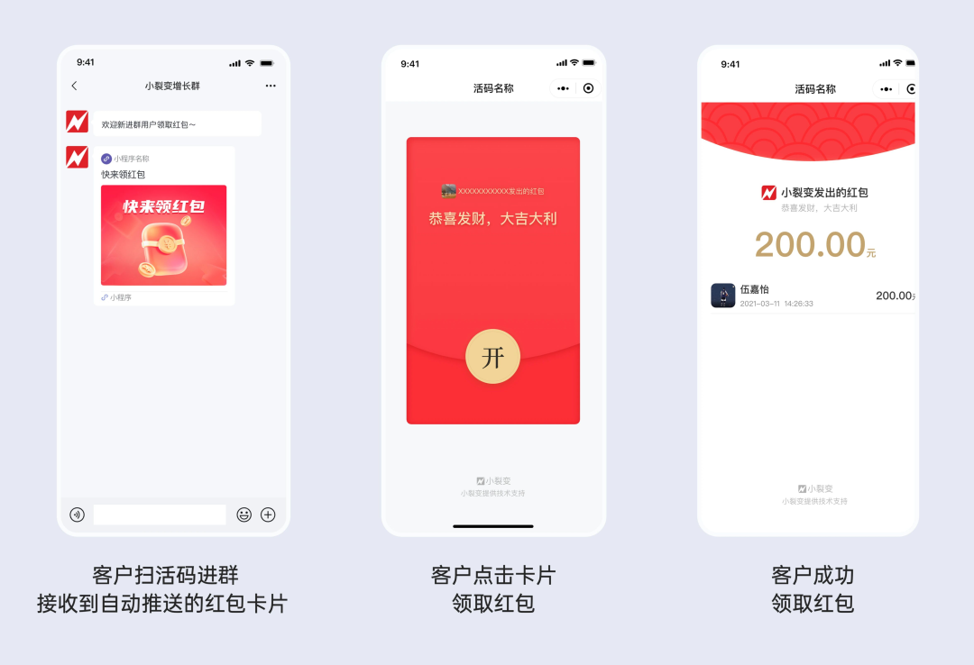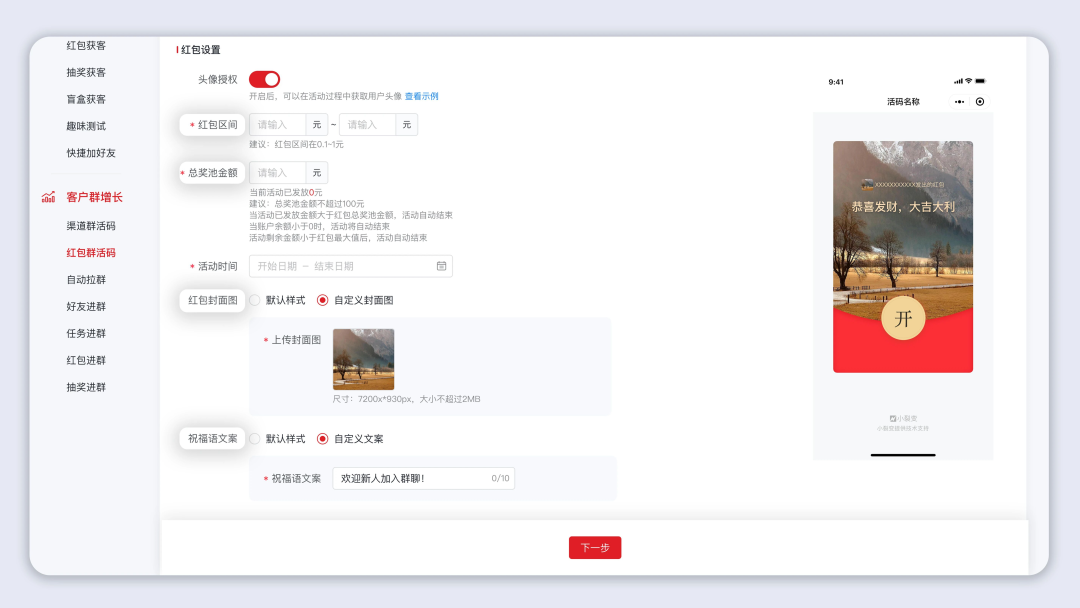 小裂变上线红包群活码功能,通过现金奖励,吸引客户扫码入群领红包。