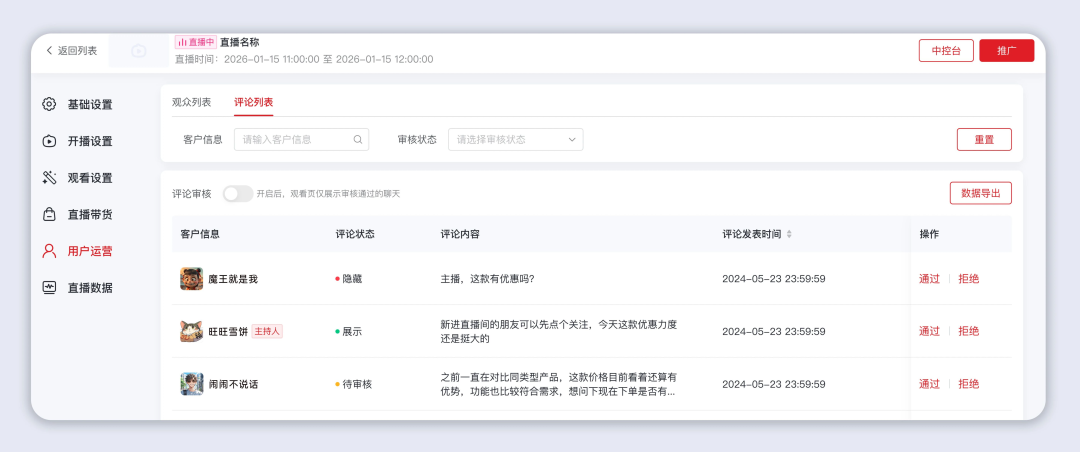 评论列表:可查看客户信息、评论状态/内容/发表时间等信息,支持开启/关闭评论审核,开启后可对直播间评论进行审核并决定是否展示,有效把控直播间互动氛围。