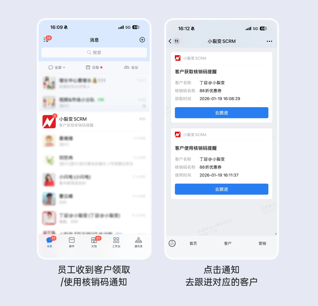 客户啥时候领券?用了吗?小裂变核销码管理帮你智能记录客户动态、自动打标签,提醒员工及时跟进,提升到店转化。