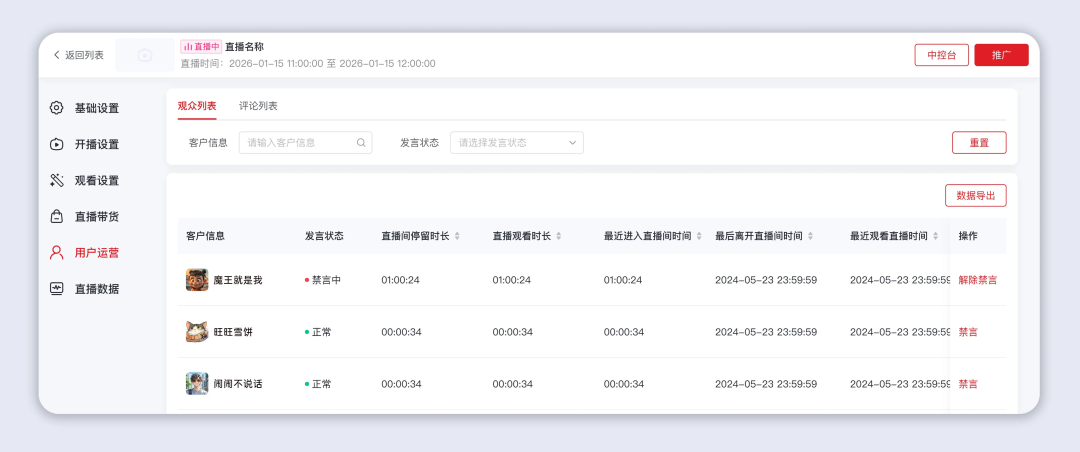 观众列表:可查看进入直播间的客户信息,包含客户信息、发言状态、直播间停留时长等关键数据,支持禁言/解除禁言操作与数据导出,方便后续精准跟进。