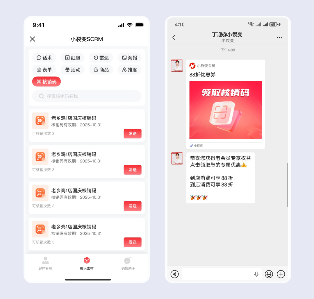 小裂变核销码功能升级,新增私域核销场景、支持多次核销,搭配智能跟进功能,让核销码管理更高效,助力门店精准发放权益、提升到店转化。