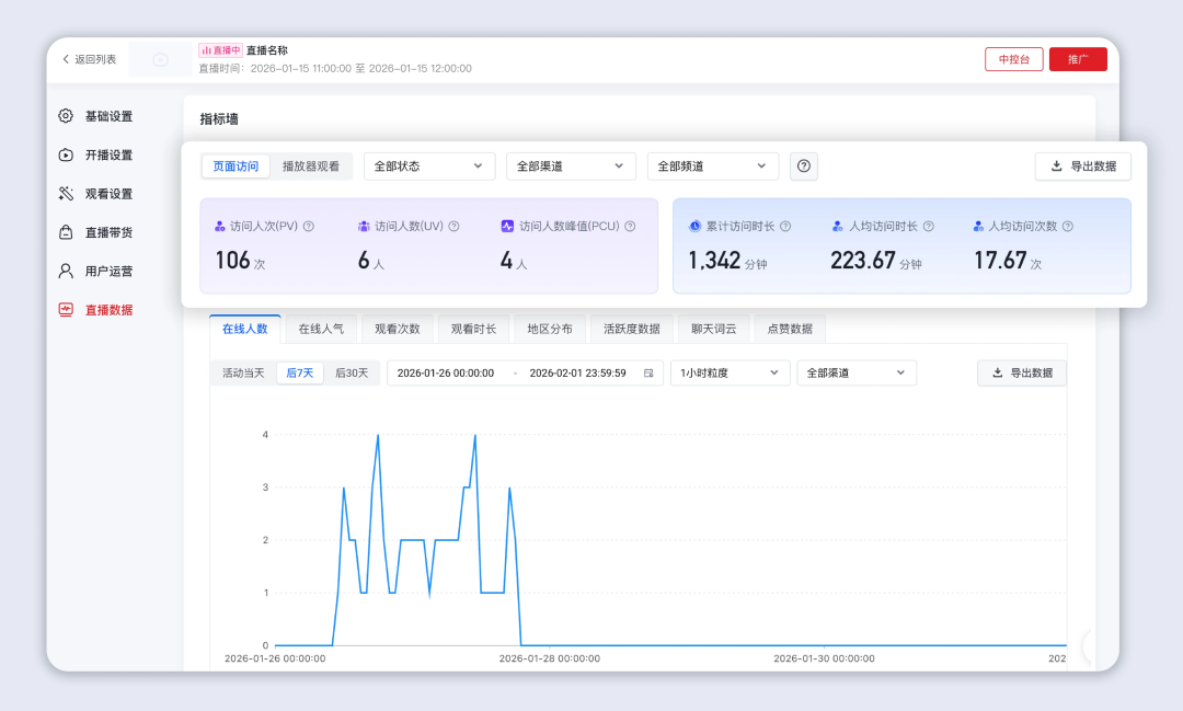 可高效筛选和查看页面访问数据(包括访问人次、人数、人数峰值、累计/人均访问时长、人均访问次数)和播放器观看数据,了解整体直播数据情况。