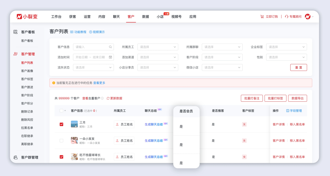 小裂变客户阶段再升级,帮助品牌商家做好私域客户全生命周期管理,让客户阶段标记更精准、销售跟进更清晰、团队管理更高效。