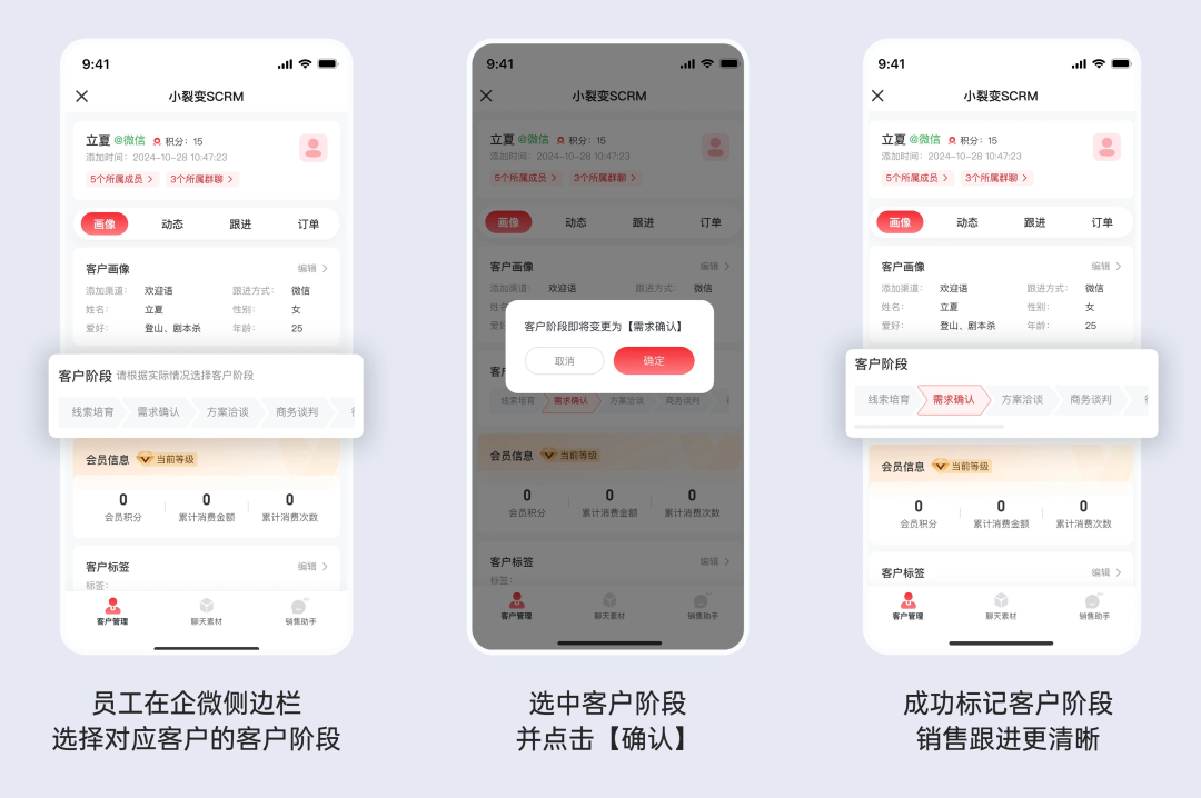 销售人员可在企业微信侧边栏根据客户跟进情况修改客户阶段。比如,销售人员沟通后确定客户需求,可快速将客户阶段从 “线索培育” 更新为 “需求确认”,操作便捷,跟进更高效。