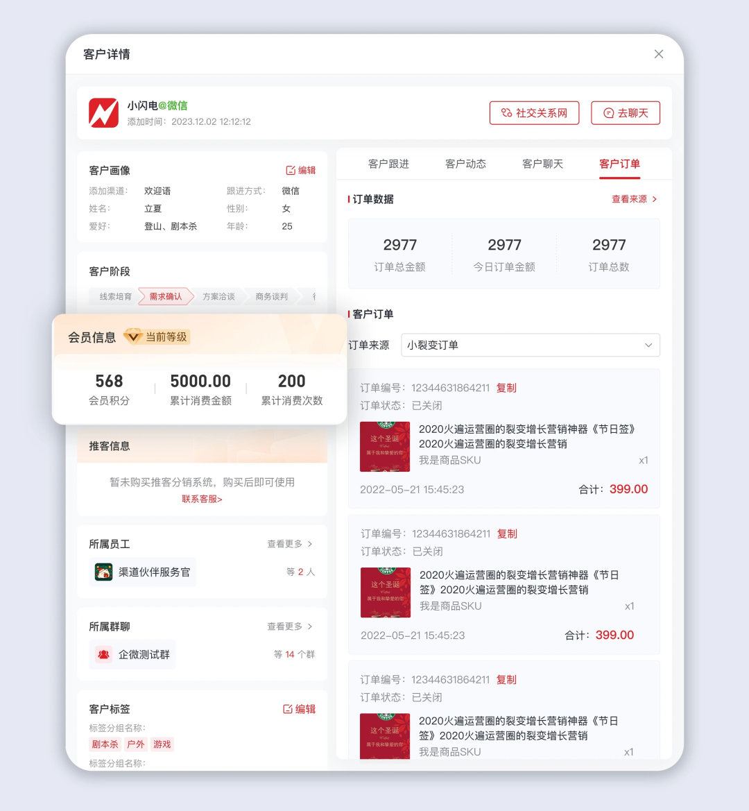 比如员工对接客户时,可通过企业微信侧边栏直接看到 “会员等级V3、积分568、累计消费5000元” 的完整信息,快速判断客户价值。