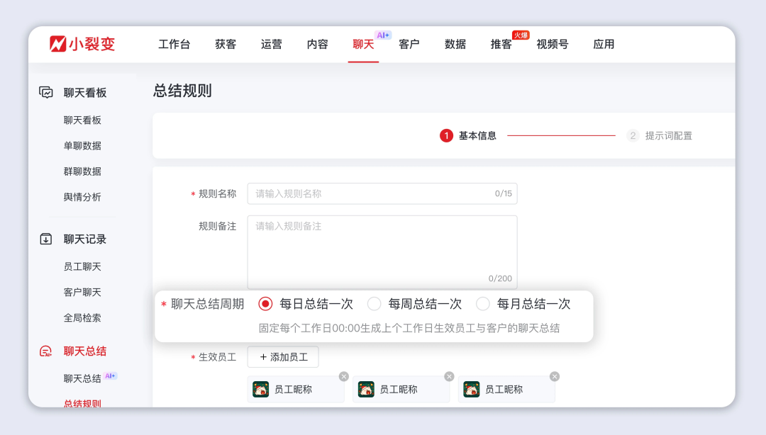 小裂变聊天总结功能全新升级,AI自动按周期总结聊天关键信息、自动对聊天情况进行评分评级,辅助销售、管理者跳过聊天信息筛选环节,快速掌握核心关键信息,让管理决策更高效、服务优化更精准。