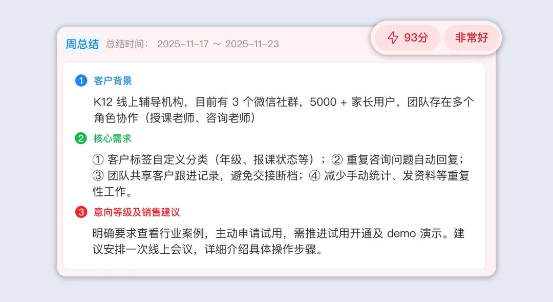 比如,销售管理者可开启日总结,实时掌握当日客户跟进情况;运营团队可设置周总结,复盘社群服务效果;管理层可通过月总结,评估月度团队服务质量与客户需求趋势,灵活适配不同管理需求。